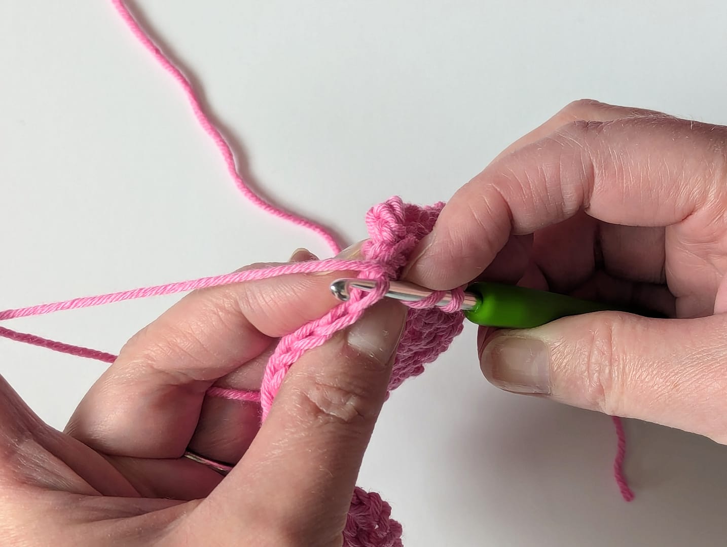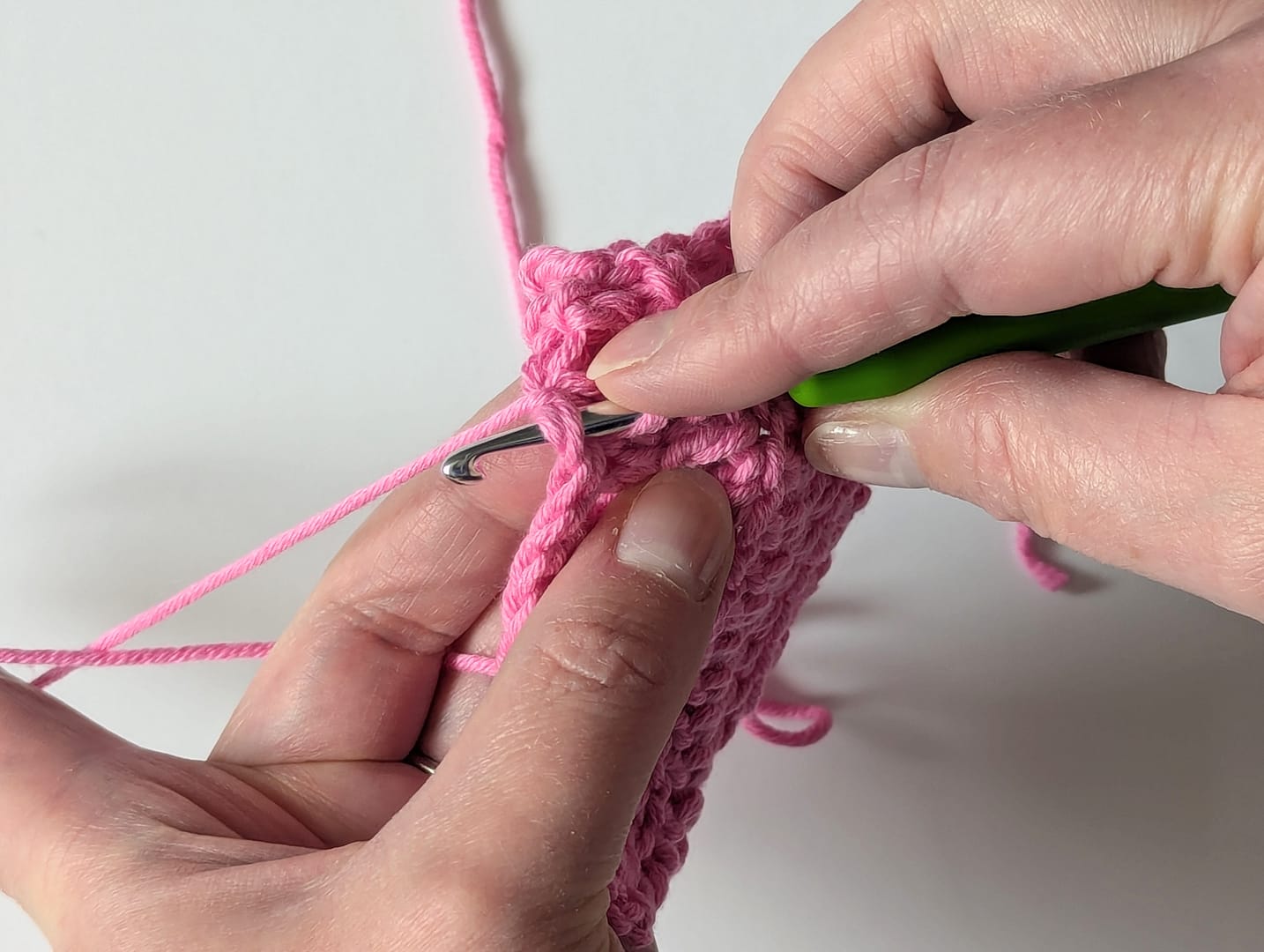 So, just to be clear, when making a traditional stitch, e.g. I have made this sample with Treble crochet (UK terms) / Double crochet (US terms), the hook is inserted under the ‘v’ stitch and therefore under both the Front and Back loops of the stitch, like so (I have made a yarn over first and then inserted the hook for this particular stitch):