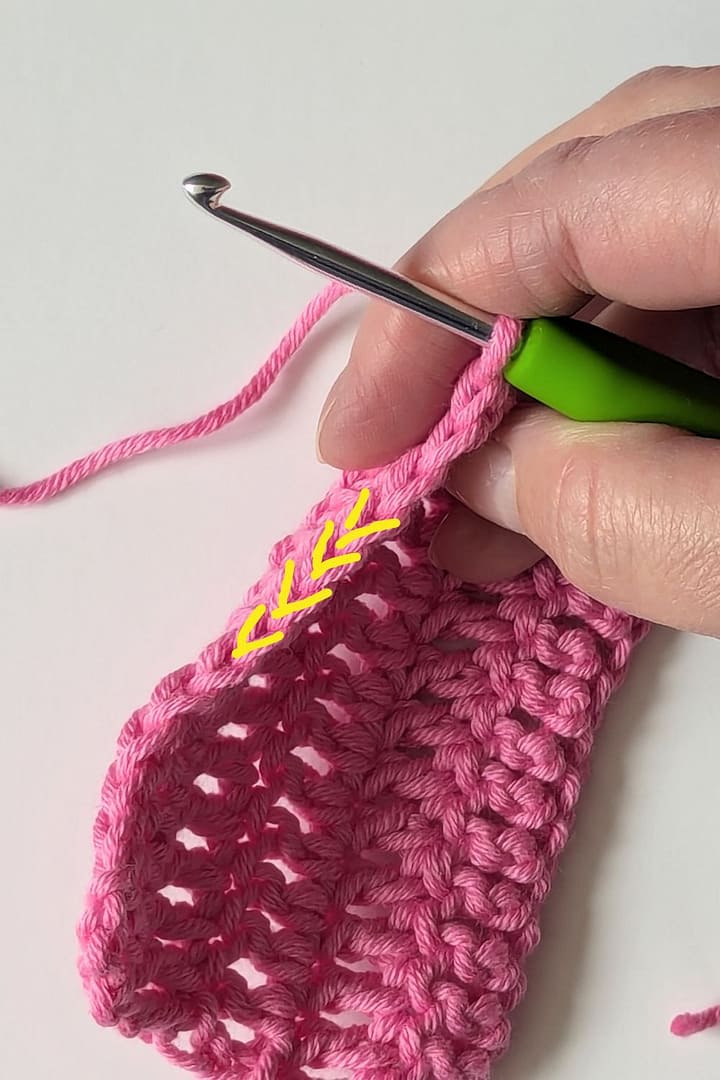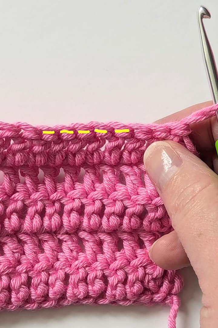 You can see on the photograph, where the yellow lines are, is where you would normally insert your hook to work the next row of stitches, underneath the ‘v’ at the top
