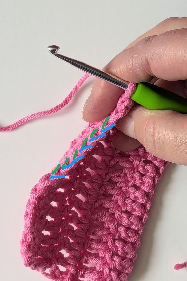 This is the same photo of the same ‘v’ stitches, however, I’ve shown the Back loops in Green and the Front loops in Blue. Basically the Back loop is the line of the ‘v’ furthest away from you as you crochet across the row, and the Front loop is the line of the ‘v’ closest to you as you crochet across the fabric, it is all just different parts of the same stitch.